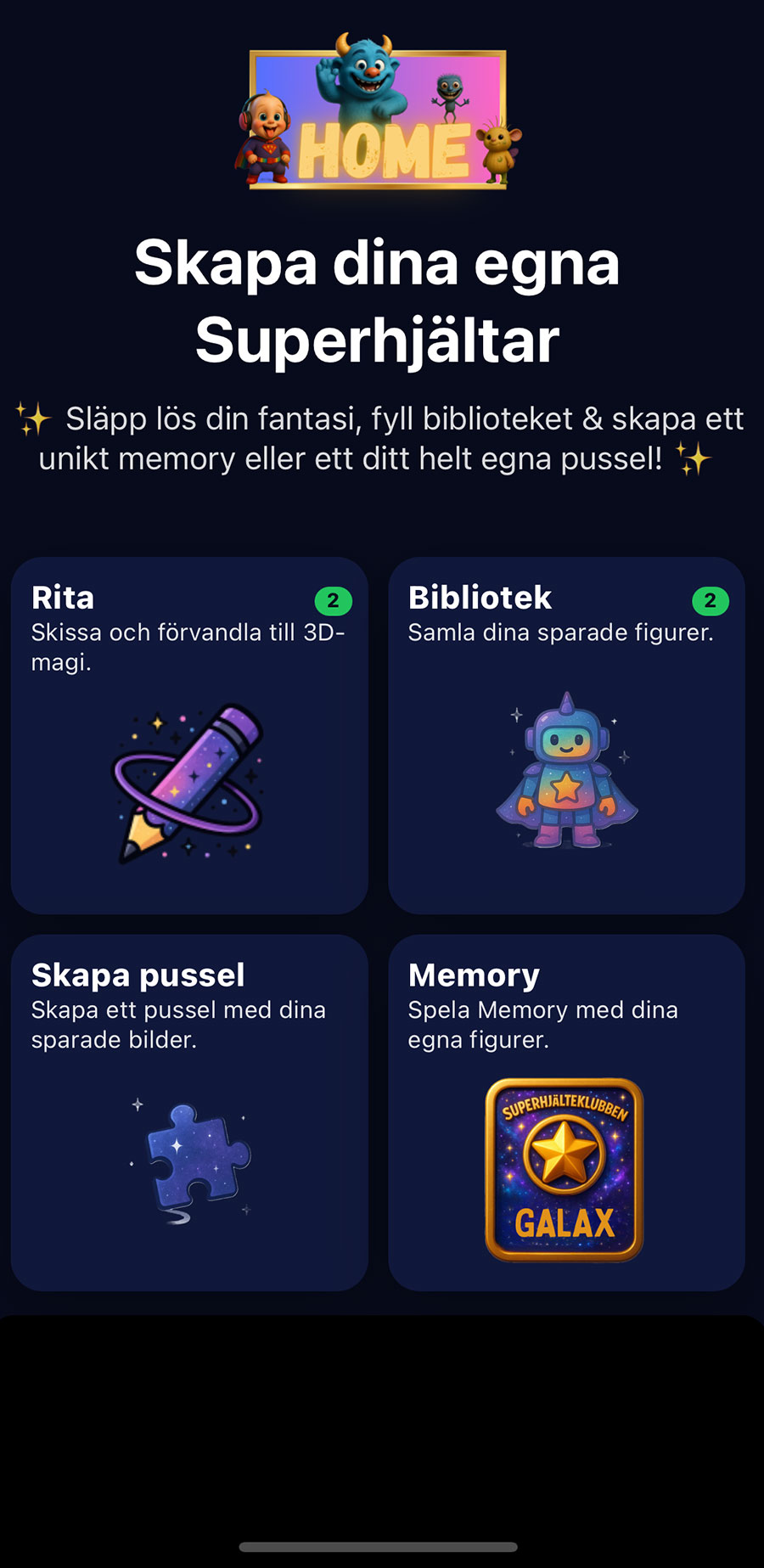 Superhjältarna finns även i vår barnvänliga app där barnen kan skapa sina egna superhjältar baserat på sina teckningar och bygga sina egna pussel eller memoryspel med figurerna. Barnen kan också lära sig alfabetet och räkna och massa annat roligt.